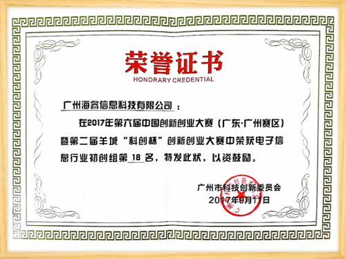 榮獲中國創(chuàng)新創(chuàng)業(yè)大賽廣州賽區(qū)優(yōu)勝獎